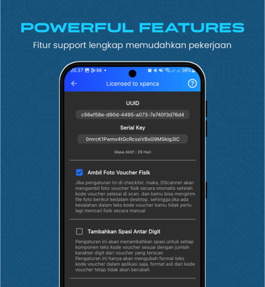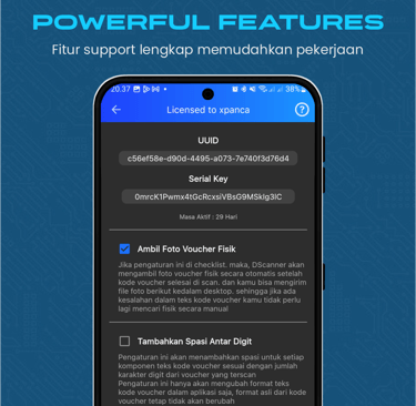 Aplikasi android untuk memindai serial number pada voucher fisik yang dilakukan secara otomatis dalam satu kali klik dengan berbagai macam fitur yang memudahkan pekerjaan input voucher ke database stok server